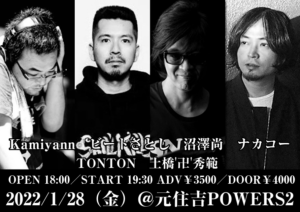 さらに詳しく »元スーパーカーのナカコー、skillkillsのドラマー・ビートさとし、GROOVEドラマー沼澤尚、MIXエンジニアKamiyannによる予測不能のスーパーセッションが実現!VJ TONTONと土橋'卍'秀範によるライティングも必見です!お見逃しなく☆ ★ナカコー+ビートさとし+沼澤尚+Kamiyann+TONTON+土橋'卍'秀範★ 2022/1/28(金…