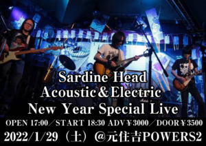 さらに詳しく »圧倒的な演奏力と個性的かつユニークな楽曲でミュージシャンやコアな音楽フリークを魅了する Sardine Head〜New Year Special Live 開催決定!アコースティックSETとエレクトリックSETの二部構成による激レアLIVE!お見逃しなく☆ ★Sardine Head〜New Year Special Live★ 2022/1/29(土)@…