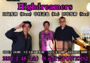 さらに詳しく »ありとあらゆるシーンで活躍するSax奏者・田中邦和、ストレイテナーのベーシスト日向秀和、元BJCのドラマー中村達也によるHighdreamersワンマンLIVE開催決定!予測不能&制御不能の完全即興LIVE!お見逃しなく☆ ★Highdreamers〜田中邦和+日向秀和+中村達也★ 2022/2/18(金)@元住吉POWERS2 OPEN 18:00/STA…