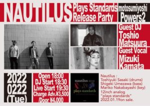 さらに詳しく »国内外のクラブシーンからも注目を集めるNautilus。全編ジャズスタンダードをカバーしたEP、 “Plays Standards” Release Live@POWERS2開催決定!ゲストボーカルにカマタミズキ、そしてなんとゲストDJに松浦俊夫氏を迎え、スペシャルバージョンでお送りします。ジャジーでソウルフルな一夜になること間違いなし!Nautilus新年…