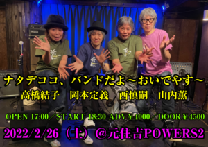 さらに詳しく »西 慎嗣と岡本定義によるナタデココが山内薫(Bass)と高橋結子(Dr)を迎えてお届けするナタデココ、バンドだよ〜第三弾開催決定!爆笑トーク&ライブで免疫力UP!おいでやす〜 ★ナタデココ、バンドだよ〜西 慎嗣+岡本定義+山内薫+高橋結子★ 2022/2/26(土)@元住吉POWERS2 OPEN 17:00/START 18:30 ADV¥4000/DOO…