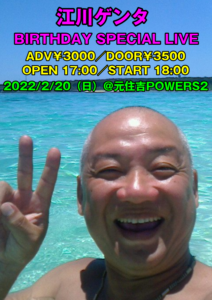 さらに詳しく »川崎が生んだスーパードラマー江川ゲンタ生誕58周年を祝してスペシャルライブ開催決定!何が起こるかわからないのが、ゲンタナイト!みんな来ないと!全員集合でお願いしまーす☆ ★GENTA NIGHT Vol.17〜江川ゲンタBIRTHDAY SPECIAL LIVE★ 2022/2/20(日)@元住吉POWERS2 OPEN 17:00/START 18:00 …