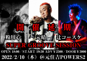 さらに詳しく »本公演は大雪予報を考慮し開催延期とさせて頂きます。心待ちにして下さっていた皆様方にはご迷惑をおかけし大変申し訳ありません。必ずリベンジします! 元SOIL&”PIMP”SESSIONSの元晴、GOMA&The Jungle Rhythm Section等で活躍する辻コースケ、元Jizueの粉川心によるSUPER GROOVE SESSION開催決定!…