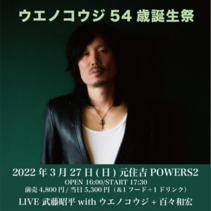 さらに詳しく »★ウエノコウジ54歳誕生祭★ 2022年3月27日(日) 元住吉POWERS2 OPEN 16:00/START 17:30 前売4,800円/当日5,300円(&1フード+1ドリンク) 若干数キャンセルが出た為、当日券を発行致します。尚、当日券のお客様は前売り予約のお客様の入場後の受付となります。よろしくお願い致します。 ■LIVE 武藤昭平 with ウ…