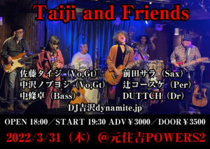 さらに詳しく »ロックスター佐藤タイジが愉快な仲間たちと共にありったけの愛ととびっきりの音楽をお届けします!超ファンキーなSax奏者・前田サラを迎えさらにパワーアップしたTaiji and Friends!お楽しみに☆ ★Taiji and Friends〜佐藤タイジ+中沢ノブヨシ+中條卓+辻コースケ+DUTTCH+前田サラ+DJ 吉沢dynamite.jp★ 2022/3…