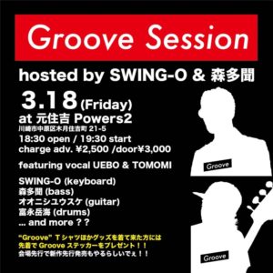 さらに詳しく »"Groove Factor"の首謀者ベーシスト森多聞と #SOUL大学 キーボードSWING-Oが 漆黒セッションを立ち上げた! Groove Tシャツほかグッズを身につけて来た人は 先行でステッカープレゼント! 会場先行で新作先行発売もやるらしいでぇ! ★”GROOVE SESSION" hosted by SWING-O&森多聞★ 2022/3/18(…