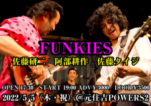 さらに詳しく »シアターブルックの佐藤タイジ、マルコシアス・バンプの佐藤研二、元THE COLLECTORSの阿部耕作によるFUNKIESワンマンLIVE開催決定!珠玉の名曲の数々をファンキーに再現します!中毒者続出中☆ ★FUNKIES〜佐藤タイジ+佐藤研二+阿部耕作★ 2022/5/5(木・祝)@元住吉POWERS2 OPEN 17:30/START 19:00(2SE…