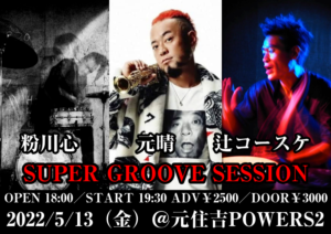 さらに詳しく »元SOIL&”PIMP”SESSIONSの元晴、GOMA&The Jungle Rhythm Section等で活躍する辻コースケ、元Jizueの粉川心によるSUPER GROOVE SESSION開催決定!お見逃しなく☆ ★SUPER GROOVE SESSION〜元晴+辻コースケ+粉川心★ 2022/5/13(金)@元住吉POWERS2 OPEN…