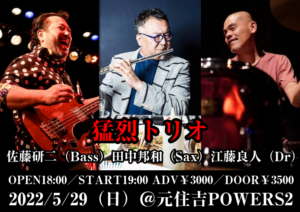 さらに詳しく »マルコシアスバンプのベーシスト佐藤研二、唯一無二のSax奏者・田中邦和、ジャズドラマー江藤良人による猛烈トリオワンマン開催決定!超絶ライブ&爆笑トークで猛烈にゴキゲンな一夜をお約束します☆ ★猛烈トリオ〜佐藤研二+田中邦和+江藤良人★ 2022/5/29(日)@元住吉POWERS2 OPEN 18:00/START 19:00 ADV¥3000/DOOR¥3…
