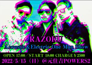 さらに詳しく »今年結成26年を迎えるスリーピースロックバンド「らぞく」のアコースティック&エレクトリック・ワンマンショー開催決定!今のらぞくの集大成を全開で魅せます!お楽しみに☆ ★らぞく〜Acoustic&Electric One Man Show★ 2022/5/15(日)@元住吉POWERS2 OPEN 17:00/START 18:00 CHARGE¥2500 …