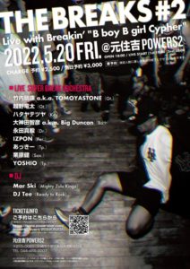 さらに詳しく »★THE BREAKS #2 ~Live with Breakin’"B boy B girl Cypher"~★ 2022/5/20(金)@元住吉POWERS2 OPEN 18:00 LIVE START 19:00〜1st/20:00〜2nd ADV¥2500/DOOR¥3000 1ドリンク+1フードのオーダーをお願いします。 ■LIVE SUPER B…