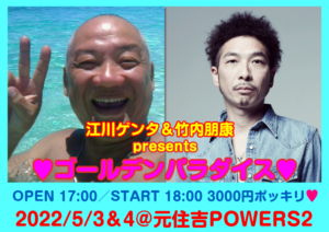 江川ゲンタと竹内朋康がゴールデンウイークに二日間に渡ってお届けする常夏&特別企画「ゴールデンパラダイス」開催決定!来た人だけが体験できる楽園が待ってるのだ!誰が来るのか?誰も来ないのか?来てからのお楽しみなのだ! ★江川ゲンタ&竹内朋康 presents ゴールデンパラダイス〜Day1★ 2022/5/3(火)@元住吉POWERS2 OPEN 17:00/S…