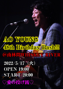 DachamboのフロントマンAO YOUNG、三年ぶりに南林間WHISKEY RIVER登場!祝48歳!年男をみんなで祝おうジャマイカ〜☆ ★AO YOUNG 48th Birthday Bash!!!@南林間WHISKEY RIVER★ 2022/5/17(火)@WHISKEY RIVER(南林間) OPEN 19:00/START 20:00(2SET…