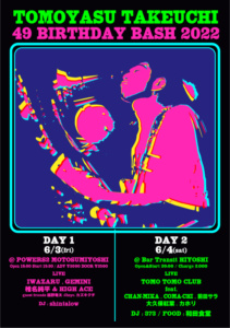 さらに詳しく »Momiji & The Bluestones、Planet Green、IWAZARU、The Out、TOMO TOMO CLUB、GEMINI等、数々のバンドで活躍するスーパーギタリスト竹内朋康 ”49th BIRTHDAY BASH” 開催決定!パーッと祝いましょう☆ ★竹内朋康 49th BIRTHDAY BASH!!!★ 2022/6/3…