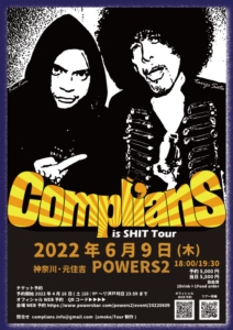 さらに詳しく »ロックスター佐藤タイジとスーパーベーシストKenKenによるComplianSがついにPOWERS2登場!ロックの日にぶちかまします!カモーン☆ ★ComplianS is SHIT Tour@元住吉POWERS2★ 2022/6/9(木)@元住吉POWERS2 OPEN 18:00/START 19:30 ADV¥5000/DOOR¥5500 1ドリンク…