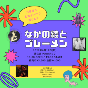 さらに詳しく »今年三月に7inch「雨あがりの夜空に」をリリースし、今ノリにノッテる魅惑のトロピカルやさぐれバンドHI☆STEADYとカマタミズキがPOWERS2に登場!パーカッショニスト岩原大輔を迎えアゲアゲな一夜をお届けします!お楽しみに☆ ★カマタミズキ with HI☆STEADY feat.岩原大輔★ 2022/6/2(木)@元住吉POWERS2 OPEN 18…