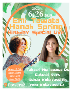さらに詳しく »Hanah Spring&多和田えみ Birthday Special Live開催決定!最高のメンバーと共に至福の一夜をお届けします!お楽しみに☆ ★Hanah Spring&多和田えみ Birthday Special Live★ 2022/6/26(日)@元住吉POWERS2 OPEN 17:30/START 19:00 ADV¥4500/DOOR¥5…