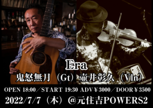さらに詳しく »是巨人、KIKI BAND、Bondage Fruit、ERA、The DUO、FRET LAND、Play Rock!!、NITRO等、数々のバンドで活躍する超絶ギタリスト鬼怒無月生誕58周年を祝う5日間。ジャンルレスに活躍する鬼怒無月ならではの多彩なラインナップは必見です! ★Era〜鬼怒無月+壷井彰久★ 2022/7/7(木)@元住吉POWERS2 O…