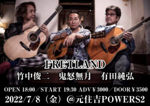さらに詳しく »是巨人、KIKI BAND、Bondage Fruit、ERA、The DUO、FRET LAND、Play Rock!!、NITRO等、数々のバンドで活躍する超絶ギタリスト鬼怒無月生誕58周年を祝う5日間。ジャンルレスに活躍する鬼怒無月ならではの多彩なラインナップは必見です! ★FRETLAND〜鬼怒無月+有田純弘+竹中俊二★ 2022/7/8(金)@元住…