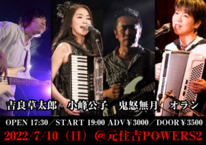 さらに詳しく »是巨人、KIKI BAND、Bondage Fruit、ERA、The DUO、FRET LAND、Play Rock!!、NITRO等、数々のバンドで活躍する超絶ギタリスト鬼怒無月生誕58周年を祝う5日間。ジャンルレスに活躍する鬼怒無月ならではの多彩なラインナップは必見です! ★鬼怒無月+小峰公子+オラン+吉良草太郎★ 2022/7/10(日)@元住吉PO…