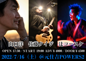 さらに詳しく »シアターブルックの佐藤タイジとHEATWAVEの山口洋と孤高のパーカッショニスト辻コースケによるスペシャルLIVE!珠玉の名曲の数々を爆笑トークと共にお届けします。お楽しみに☆ ★佐藤タイジ+山口洋+辻コースケ★ 2022/7/16(土)@元住吉POWERS2 OPEN 17:30/START 19:00(2SET) ADV¥4000/DOOR¥4500 …
