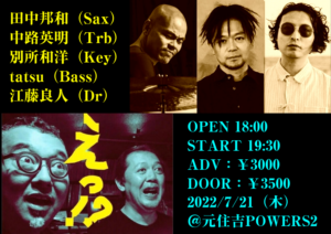 さらに詳しく »本公演は田中邦和氏の体調不良の為、開催延期となります。楽しみにされていた皆様には深くお詫び申し上げます。延期日程決まり次第お知らせしますので、ご理解の程よろしくお願い致します。 ★エセクルセイダーズ〜田中邦和+中路英明+別所和洋+tatsu+江藤良人★ 2022/7/21(木)@元住吉POWERS2 OPEN 18:00/START 19:30 ADV¥30…