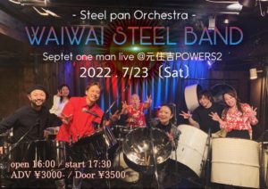 さらに詳しく »トリニダード・トバゴで生まれた楽器・スティールパンを通して独自のスタイルで追求する音楽を「WAIWAIミュージック」と提唱するWAIWAI STEEL BAND。2008年結成、世代とルーツを超え、よりソリッドなサウンドを貫く13人のメンバーが集結。突き抜ける多幸感と躍動感に溢れた音楽を世に解き放つ!今回は7人編成にてPOWERS2ワンマン開催決定!!お楽し…