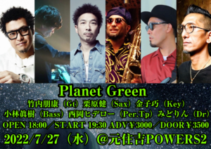 さらに詳しく »元SUPER BUTTER DOGのギタリスト竹内朋康率いるPlanet GreenワンマンLIVE開催決定!THE BANG ATTACK等で活躍する小林眞樹、SOIL&”PIMP”SESSIONS等で活躍する栗原健、Venue Vincentの西岡ヒデロー、Cro-magnonの金子巧、SOIL&”PIMP”SESSIONSのみどりんとい…