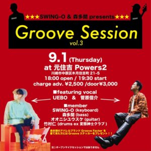 漆黒ミュージシャンSWING-Oと森多聞が組んでスタートしたライブイベント"Groove Session"のvol.3が決定!今回は現在絶好調な男SOULシンガー二人の競演!そしてドラムも超強力な竹村仁(from 変態紳士クラブ)が参戦!これは必見必聴ですぞ!! ★SWING-O & 森多聞 presents Groove Session Vol.3…