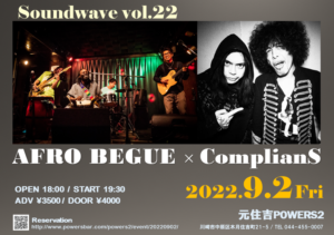 さらに詳しく »Afro Begue presents Soundwave Vol.22開催決定! 今回のゲストはロックスター佐藤タイジとベースヒーローKenKenの最強タッグバンド・ComplianSが登場! この日は別名「KenKen祭」!セッションはどうなることか!? ロックでファンキーでハッピーな時間、アゲアゲでいきますよー!! ★Afro Begue presen…