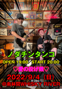 さらに詳しく »PUSHIM等のサポートで活躍するギタリストNODATINとHOME GROWNのベーシストTancoによるスーパーデュオ「ノダチンタンコ」が南林間WHISKY RIVERに再び登場!珠玉の名曲の数々をお届けします。お楽しみに☆ ★ノダチンタンコワンマンライブ★ 2022/9/4(日)@南林間WHISKY RIVER OPEN 19:00/START 20:…