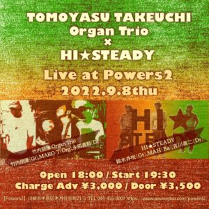 さらに詳しく »元SUPER BUTTER DOGのギタリスト竹内朋康の新バンド・竹内朋康Organ Trioと魅惑のトロピカルやさぐれバンドHI☆STEADYのツーマンライブ開催決定!お楽しみに☆ ★竹内朋康Organ Trio × HI☆STEADY★ 2022/9/8(木)@元住吉POWERS2 OPEN 18:00/START 19:30 ADV¥3000/DOOR…