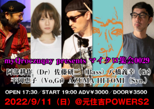 さらに詳しく »myQroczuqay presents マイクロ集会0029開催決定!今回も素晴らしいメンバーと共にスーパーセッションと爆笑トークをお届けします!お楽しみに☆ ★myQroczuqay presents マイクロ集会0029★ 2022/9/11(日)@元住吉POWERS2 OPEN 17:30/START 19:00 ADV¥3000/DOOR¥3500…