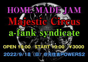 さらに詳しく »2002年の結成から日本を代表するJam Bandとして活躍し続けるMajestic Circus presents HOME MADE JAM開催決定!今回は愛知県から盟友a-fank syndicateを迎えゴキゲンな一夜をお届けします☆踊れー! ★HOME MADE JAM〜Majestic Circus × a-fank syndicate★ 202…