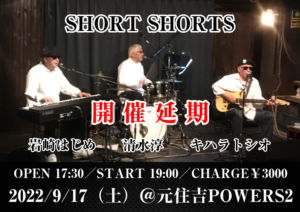さらに詳しく »本公演はメンバー体調不良の為、開催延期となります。楽しみにされていた皆様には深くお詫び申し上げます。延期日程決まり次第お知らせしますので、ご理解の程よろしくお願い致します。 ★SHORT SHORTSワンマンLIVE★ 2022/9/17(土)@元住吉POWERS2 ■LIVE SHORT SHORTS キハラトシオ(Vo,Gt)from NOBODY 岩崎…