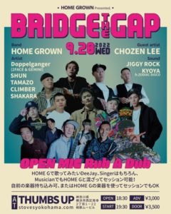 さらに詳しく »日本が誇るNo.1ダンスホールレゲエバンドHOME GROWN presents BRIDGE THE GAP開催決定!新進気鋭の若手アーティストを迎えたスペシャルナイト!さらにDeeJay、Singer、Musicianの飛び入りセッションコーナー「OPEN MIC Rub A Dub」もあり!集え若者!You get a chance!SPゲスト:CHO…