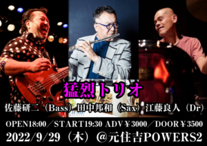 さらに詳しく »マルコシアスバンプのベーシスト佐藤研二、唯一無二のSax奏者・田中邦和、ジャズドラマー江藤良人による猛烈トリオワンマン開催決定!超絶ライブ&爆笑トークで猛烈にゴキゲンな一夜をお約束します☆ ★猛烈トリオ〜佐藤研二+田中邦和+江藤良人★ 2022/9/29(木)@元住吉POWERS2 OPEN 18:00/START 19:30 ADV¥3000/DOOR¥3…