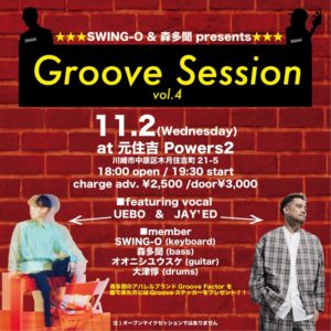 漆黒ミュージシャンSWING-Oと森多聞が組んでスタートしたライブイベント"Groove Session"のvol.4が決定!フィーチャリングボーカルは、レギュラー化したUEBOに加えて今回はなんとJAY'EDの参戦が決定!!これは必見です!! ★SWING-O & 森多聞 presents Groove Session vol.4★ 2022/11…