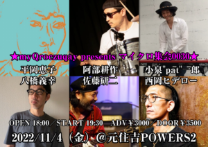 さらに詳しく »myQroczuqay presents マイクロ集会0030開催決定!今回も素晴らしいメンバーと共にスーパーセッションと爆笑トークをお届けします!お楽しみに☆ ★myQroczuqay presents マイクロ集会0030★ 2022/11/4(金)@元住吉POWERS2 OPEN 18:00/START 19:30 ADV¥3000/DOOR¥3500…