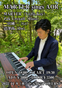 さらに詳しく »魅惑のハスキーボイスと日本人離れしたソウルフルなボーカルに定評のあるMARTERが素晴らしいミュージシャンと共に珠玉のAORナンバーをお届けします!お見逃しなく☆ ★MARTER sings AOR〜MARTER+Zak Croxall+二宮純一+沼澤尚★ 2022/11/9(水)@元住吉POWERS2 OPEN 18:00/START 19:30 ADV¥…