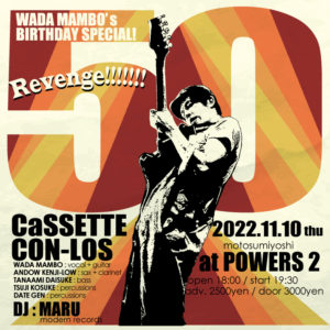 さらに詳しく »永遠の浪人生ことワダマコトa.k.aワダマンボ生誕50周年を祝してカセットコンロスワンマン開催決定!今年の2月に開催予定でしたがやっと実現します!みんなでワイワイお祝いしようジャマイカ〜! ★ワダマンボ生誕50周年記念スペシャルライブ★ 2022/11/10(木)@元住吉POWERS2 OPEN 18:00/START 19:30 ADV¥2500/DOOR…