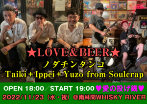 さらに詳しく »PUSHIM等のサポートで活躍するギタリストNODATINとHOME GROWNのベーシストTancoによるスーパーデュオ「ノダチンタンコ」が南林間WHISKY RIVERに再び登場!さらにスカ・レゲエシーンはもちろん、モッズ、パンク、ガレージなど各方面から熱い支持を集める”RIDDIM&BLUES”バンド「Soulcrap」からTaiki、Ippet、Yu…