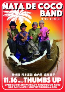 さらに詳しく »西 慎嗣と岡本定義によるナタデココが山内薫(Bass)と高橋結子(Dr)を迎えてお届けするナタデココバンドが横浜THUMBS UPに初登場!ゴキゲンなライブと爆笑トークでゆるゆる〜っとやってます。是非遊びに来てください☆ ★ナタデココバンド〜西 慎嗣+岡本定義+山内薫+高橋結子★ 2022/11/16(水)@横浜THUMBS UP OPEN 18:30/ST…