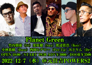 さらに詳しく »元SUPER BUTTER DOGのギタリスト竹内朋康率いるPlanet GreenワンマンLIVE開催決定!CHOZEN LEE and THE BANG ATTACK等で活躍する小林眞樹と渡辺貴浩、SOIL&”PIMP”SESSIONS等で活躍する栗原健、Venue Vincentの西岡ヒデロー、SOIL&”PIMP”SESSIONSのみ…