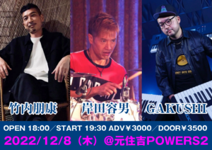 さらに詳しく »日本のトップFUNKドラマー岸田容男、数々のメジャーアーティストのプロデュースやサポートを務めるキーボーディストGAKUSHI、Momiji&The BluestonesやPlanet Green、IWAZARU等で活躍するスーパーギタリスト竹内朋康によるスペシャルライブ開催決定!お楽しみに☆ ★岸田容男+GAKUSHI+竹内朋康★ 2022/12/8(木)…