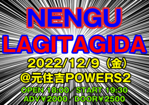 さらに詳しく »ギタリスト・オータケコーハン率いるインストプログレロックバンドLAGITAGIDAと東京の激スリーピースインストバンドNENGUによる超絶&悶絶なツーマン開催決定!忘年会じゃー!! ★LAGITAGIDA × NENGU★ 2022/12/9(金)@元住吉POWERS2 OPEN 18:00/START 19:30 ADV¥2000/DOOR¥2500 1ド…