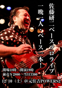 さらに詳しく »マルコシアス・バンプのベーシスト佐藤研二による”一晩一人・ベース1本!”Gibson+Marshallで滅多やたらの弾き倒し!オリジナル曲からCreamやZepなどロック名曲弾き語りまで。これが案外楽しいのですよ!お見逃しなく! ★佐藤研二ベースSOLOライブ「一晩一人・ベース1本!」★ 2022/12/10(土)@元住吉POWERS2 OPEN 18:00…