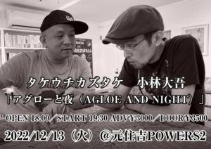 さらに詳しく »2022年、突然リリースされ始めた共同名義の新プロジェクト「アグロー案内」 既に3作品が世に放たれたとあって、2人のライブ&トークで、その真意が解き明かされる、かもしれない。 途中休憩を挟み、45分目処のステージ×2回、で開催する予定です。 素敵なお食事を楽しみながら、のんびりした気分で御参加下さい。 ★タケウチカズタケ+小林大吾〜「アグローと夜(A…