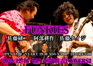 さらに詳しく »シアターブルックの佐藤タイジ、マルコシアス・バンプの佐藤研二、元THE COLLECTORSの阿部耕作によるFUNKIESワンマンLIVE開催決定!珠玉の名曲の数々をファンキーに再現します!中毒者続出中☆ ★FUNKIES〜佐藤タイジ+佐藤研二+阿部耕作★ 2022/12/16(金)@元住吉POWERS2 OPEN 18:00/START 19:30(2SE…