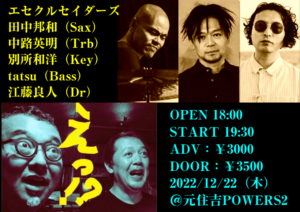 さらに詳しく »真面目本気でクルセイダーズの曲をやります。2人でもビッグバンド、中路英明(trombone)と田中邦和 (woodwinds)にスーパードラマー江藤良人、霊界と浮世を繋ぐベーシストtatsu、ノリにノってるピアニスト別所和洋。この素晴らしいメンバーでお送りします! ★エセクルセイダーズ〜田中邦和+中路英明+別所和洋+tatsu+江藤良人★ 2022/12/2…